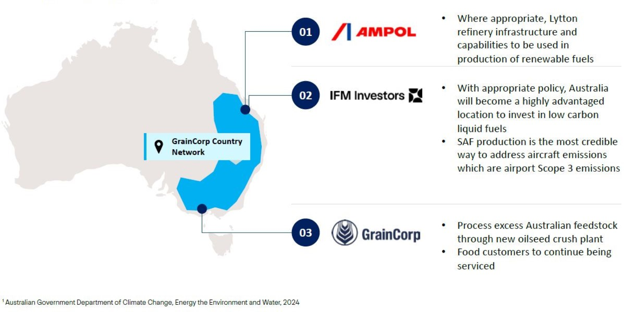 In July 2024, AMPOL, GrainCorp, and IFM signed an MOU to explore the establishment of an integrated renewable fuels industry in Australia.