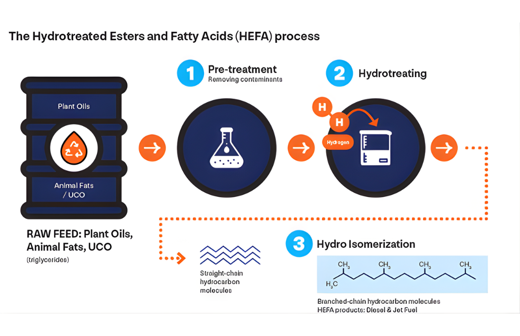 The first step of the HEFA process involves the removal of oxygen by hydrodeoxygenation before the straight-paraffinic molecules are cracked and isomerized to the appropriate chain length for either SAF or RD.