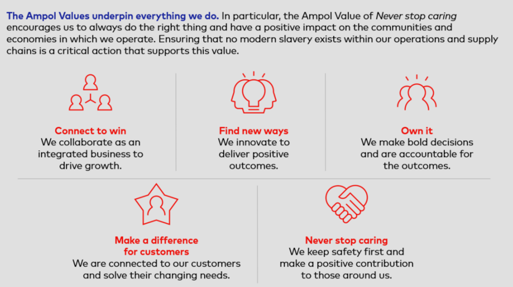 Our approach to modern slavery is underpinned by the Ampol Values and the Ampol Risk Management Framework which is based on the United Nations Guiding Principles on Business and Human Rights.