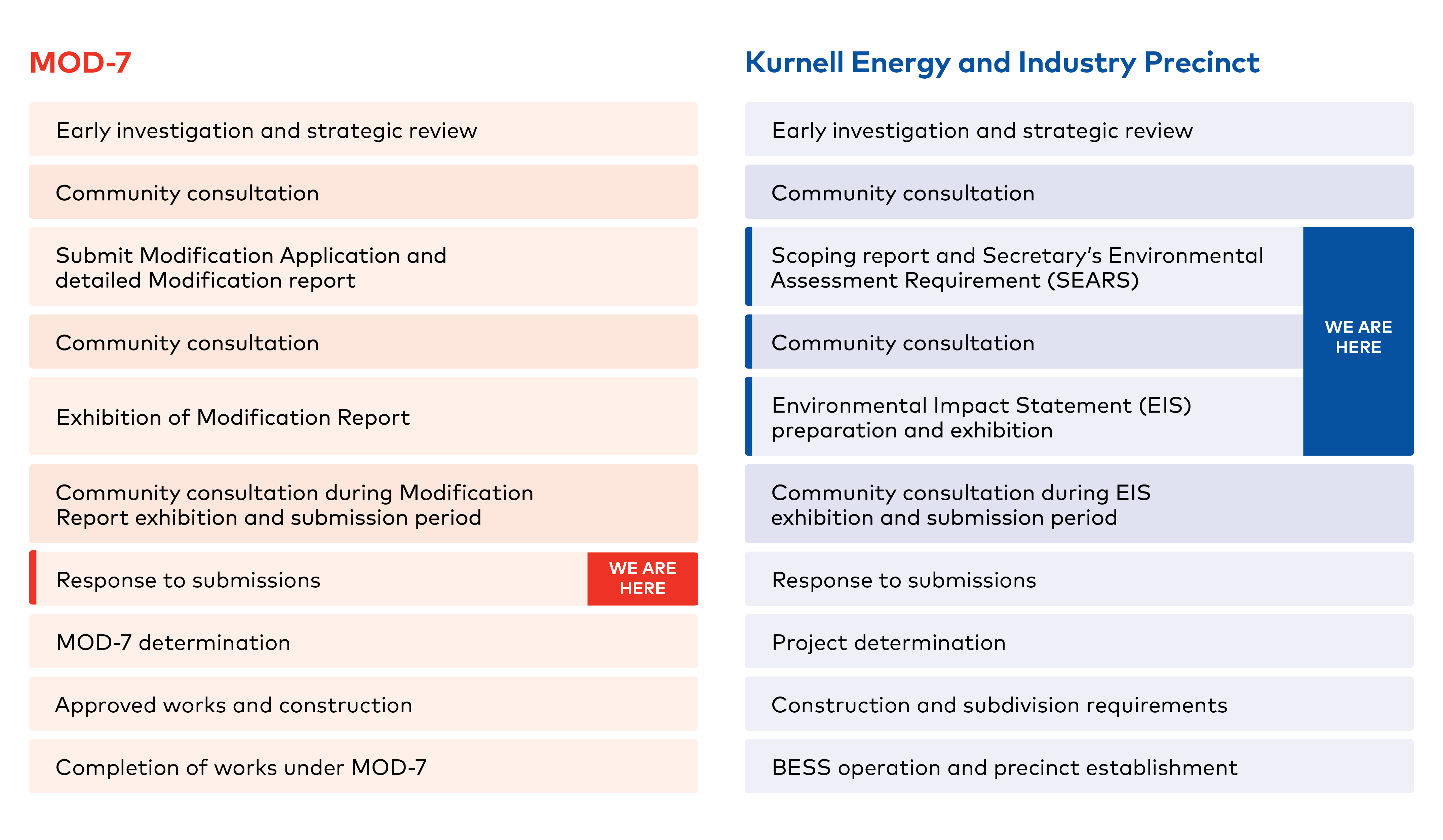 The Kurnell Energy & Industry Hub and Mod-7 will undergo State Approvals pathways under the guidance of the NSW Department of Planning, Housing and Infrastructure (DPHI). This process will involve engagement with the Sutherland Shire Council and key NSW agencies, with active consultation from the community.